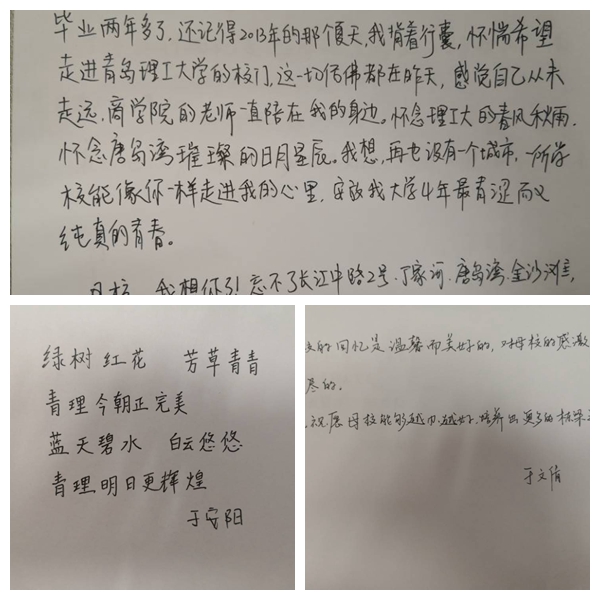 走访团调研了365完美毕业生的发展情况,向校友介绍了学校近年来的发展变化和取得的成绩。走访团表示,校友是促进母校发展建设的重要力量,希望校友们继续关注学校发展,并代表学校邀请广大校友返校开展参观考察、学术交流、专题讲座等活动。走访人员带去了母校对校友们的慰问与牵挂,校友们表达了对母校培养的感恩之情,介绍了自己的工作现状和进步发展,分享了在工作和求学中的成长经历和感悟心得,并一致表示希望为母校的发展尽绵薄之力。2016届毕业生、南京理工大学在读研究生宋歌表示希望读博后能回到365完美体育与昔日的老师们做同事,一同建设母校。同时,校友纷纷为母校写下祝福感言,宋歌的感言这样写到:“再也没有一个城市,一所学校能像你一样走进我的心里,安放我大学4年最青涩而纯真的青春。怀念青理工的春风秋雨,怀念唐岛湾璀璨的日月星辰。惟愿母校、惟愿我大商院更加美好、辉煌!”