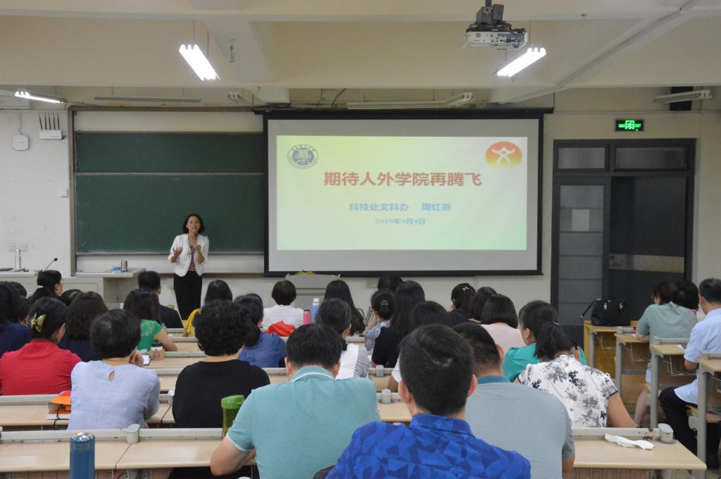 9月5日下午,人文与外国语学院在嘉陵江路校区主教学楼B204举行第48期新论语讲坛科研讲座,此次讲座由科技处副处长周红燕主讲,题为“期待人外学院再腾飞——文科科研政策解读”。学院党政班子成员及教师60余人参加了此次讲座。讲座由副院长郭印主持。