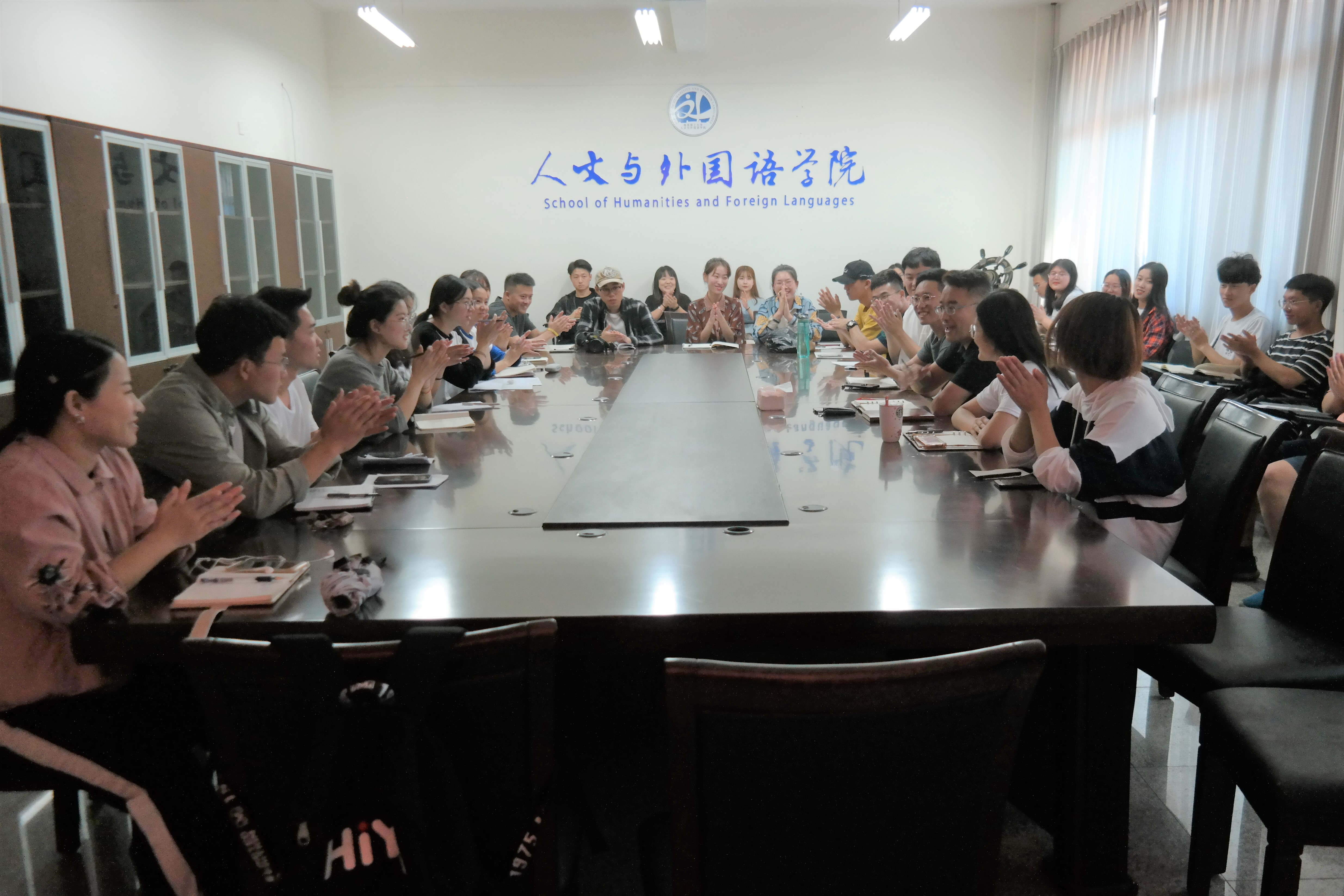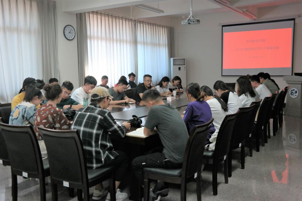 新学期、新风貌,为了解学生第一手信息,更好的开展学院学生工作,9月18日,人文与外国语学院在主教A410会议室召开“新学期,新风貌”学生干部座谈会。会议由党总支副书记王振主持,辅导员贾舒文、王才升,16、17、18级各班班团参加此次会议,旨在听取学生对于搬入新校区后在生活、思想和学习方面的意见及建议。
