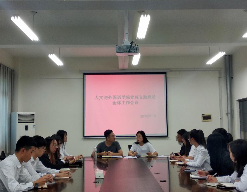 新学期之际,为让全体助理员明确本学期的工作任务和要求,完善党总支助理员建制体系,推进学院工作的顺利进行。9月18日下午五点,人文与外国语学院在主教A410会议室召开党总支助理员全体工作会议。会议由辅导员贾舒文主持,辅导员王才升及全体党总支助理员参加此次会议。