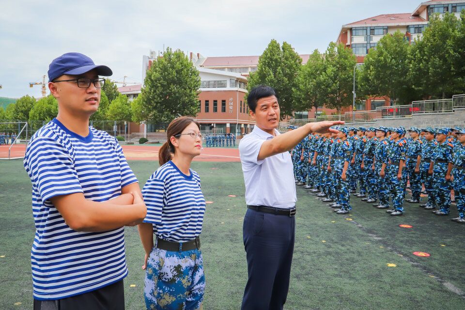 9月17日下午两点半,信息与控制工程学院党总支书记董典同、党总支副书记曲良波、副院长聂廷远、赵景波、宋传旺、分团委书记(学工办主任)张英华一行七人深入军训现场,视察学院2019级新生的军训工作,询问军训进展及训练情况,慰问教官和新生。