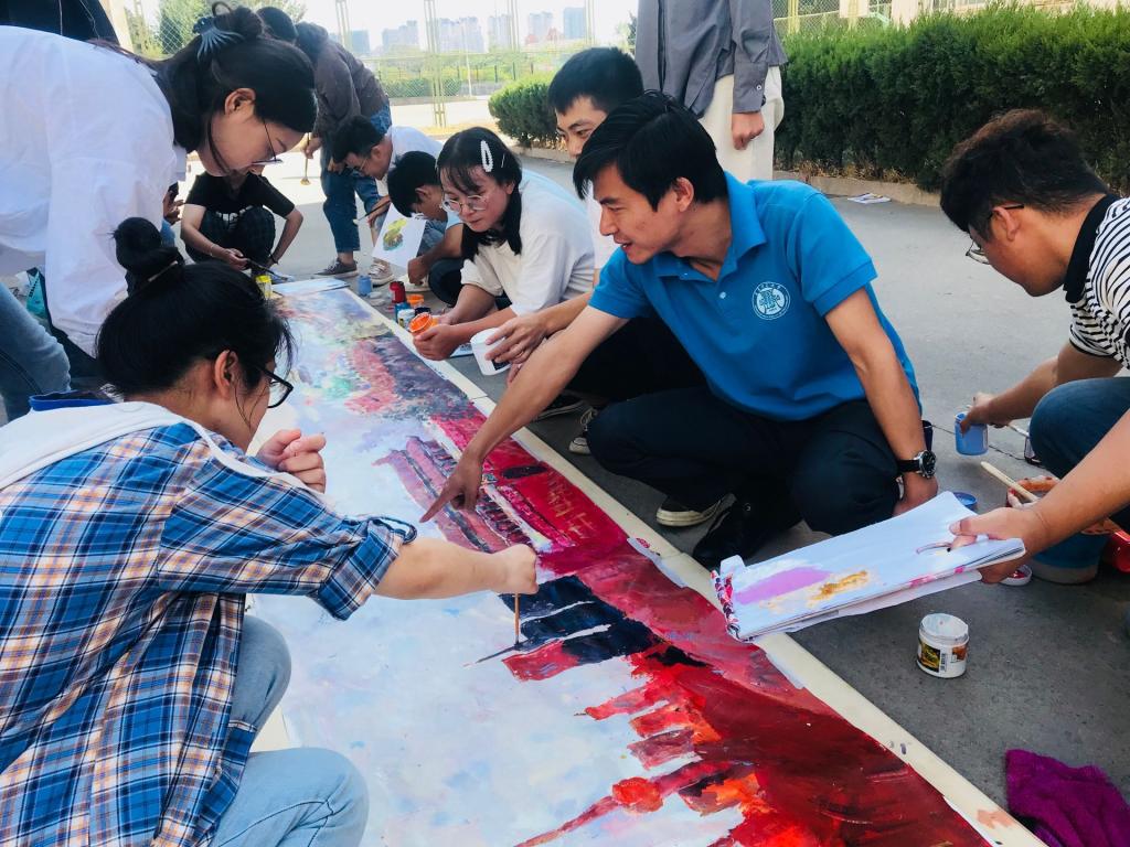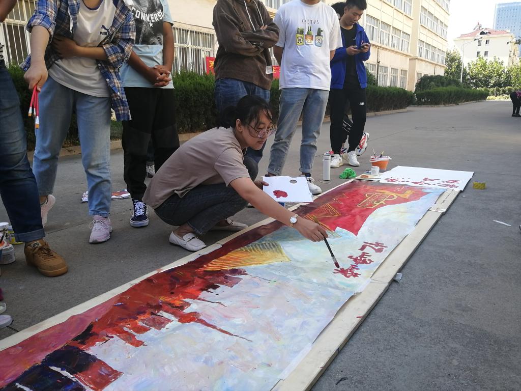 按照活动安排,同学们提前准备好了丙烯颜料、画笔等物品。在活动现场,近200余名师生一起用手中的画笔将对伟大祖国最真挚的爱绘在长卷上:天安门、国旗、长城、祝福祖国的话语……他们细心构图,用画笔表达着各自的激动心情,一条条柔和流畅的线条、一个个生动的形象,他们有的将自己的梦想和心愿通过画笔下的美丽色彩呈现出来;有的将自己对祖国的祝福与对未来的向往通过画笔渲染出来,师生共同完成的作品不仅内容健康、积极向上,而且视野开阔、选题新颖,在体现我院艺术专业学子在绘画艺术方面奇思妙想的同时,也展现了师生对祖国的热爱和对未来的期盼。