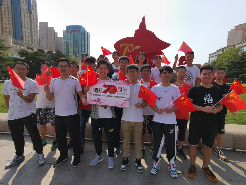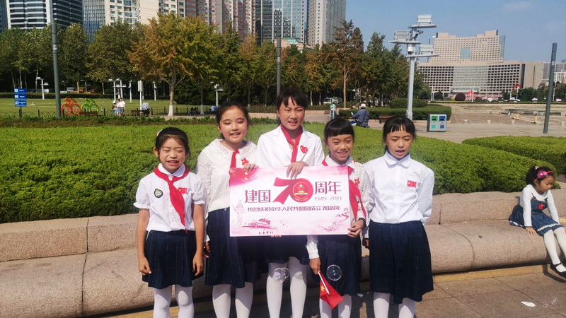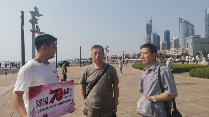 迎着朝阳,同学们手持国旗、宣传板一路来到五四广场,周边矗立的庆祝中华人民共和国成立七十周年大型景观造型,气势巍峨,一股爱国热情和民族自豪感油然而升。同学们向老人、青年、儿童赠送国旗,同时征集大家对祖国的生日祝福,怀抱主题宣传板留下光影瞬间,还与一群小学生一同唱起《我和我的祖国》,喜悦之情发自内心而溢于言表。爱国不是一句空话,看到广场上散落的垃圾,同学们和环卫工人就一道干起来,用实际行动把口号落到实处。