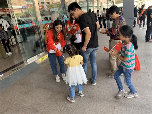 上午七点,同学们来到了西海岸汽车东站,汽车站负责工作人员对各位志愿者的工作做出了具体安排,将志愿者分配到不同的活动工作岗位展开服务活动。有的同学手握国旗为乘客与工作人员们提供帮助、送去祝福;有的同学为迷路的人群指路,为有困难人群购票,拿行李,还赠与他们表达爱国热情的小红旗。之后,同学们还为司机师傅与工作人员们送去了祝福与慰问,也送去了带着爱国情怀与民族自豪感的国旗与中国结。志愿者们一丝不苟的工作态度、良好的精神面貌和文明素养得到了汽车站工作人员和广大旅客的好评。