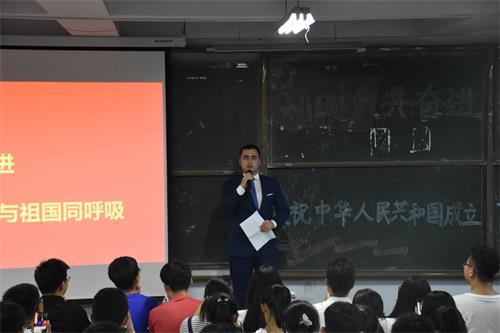 在中华人民共和国成立70周年之际,为讴歌新中国成立后,特别是改革开放以来取得的巨大成就,展示土木学子良好的精神风貌,激发广大青年的爱国之情、报国之志、兴国之责。9月29日,土木工程学院在1教300阶举办“新时代共奋进,我与祖国同呼吸”庆祝中华人民共和国成立70周年主题演讲比赛。学院分团委书记王中帅,辅导员杜诗琳、徐杨杨,留学生金宝、刘明旭及2019级全体同学参加比赛。