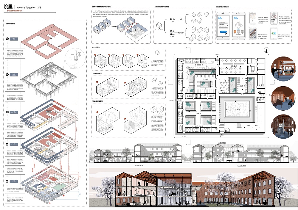 优秀奖作品《院里》通过分析青岛里院老街区管理混乱、人口流失、房屋缺乏修缮等现存问题,结合青年人初入社会的重重需求和困难,提出了将青年人作为新的活力人群引入街区从而达到恢复里院往日盛景的目的。具体实施过程中,保留里院原有的肌理和生活模式,建立以街道网格为单元的青年生活聚集地,在提升原有的起居功能之外,引入了商业、休闲、学习、创业工作等多种青年人所需功能,形成完整一体的里院院里社区,吸引青年人前来工作创业生活。在有机更新手法上,提取里院原有的单元式起居元素,采用最新的模块化概念,重新定义里院的室内空间和灰空间,充分发挥庭院的交通和沟通作用,通过单元模块空间的组合形成了流动自由的共享空间,在保证绿化环境的同时,生成了众多属于青年人的社交空间,进一步促进了青年人的思想交流,为社区的和谐繁荣提供了可能。