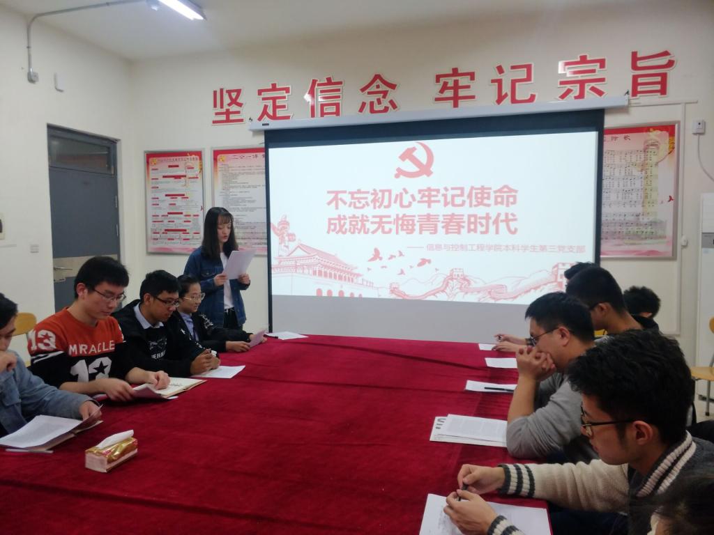 10月23日下午,信息与控制工程学院本科学生三支部在七公寓党员活动室举办“不忘初心、牢记使命,成就无悔青春时代”主题研讨会,支部书记薛腾飞主持会议,支部第7期发展对象参加学习研讨。