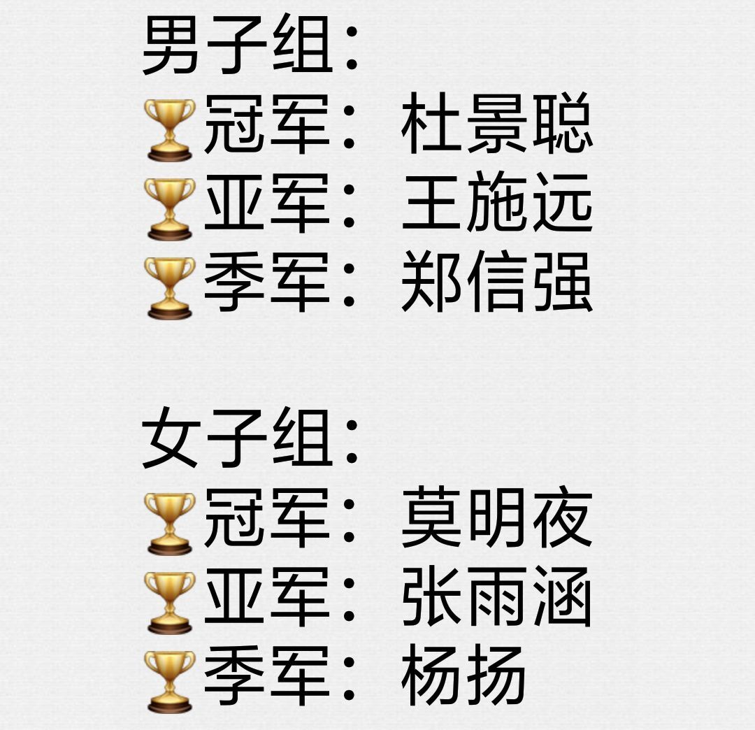 本次比赛共分为男单,女单两个项目。每个单项均通过淘汰赛依次决出比赛名次。比赛开始前,参赛队员都积极热身,调整心态。比赛开始后,选手们大展身手。选手们强有力的挥拍,灵活的接球,高技巧的搏杀,让羽毛球运动的魅力感染全场。有的选手猛扣网前球,球擦网而过,观众们也屏息凝神。对手也不甘示弱,俯身伸手一挑,球没有落地,又飞过球网,避免了失分,观众区响起热烈的掌声;有的选手更是善发高远球,对方选手稍不留神便接不住这种球;更多的是两位选手实力相近,球在球网上时而急促时而轻柔的飞过,并没有很快落地,观众紧盯飞旋的球,焦灼的赛事让球场气氛达到高潮。最终排名在各参赛队员的激烈角逐下揭晓,杜景聪获得男子组冠军,王施远获得亚军,郑信强获得季军。莫明夜获得女子组冠军,张雨涵获得亚军,杨扬获得季军。至此,新生羽毛球比赛圆满结束。