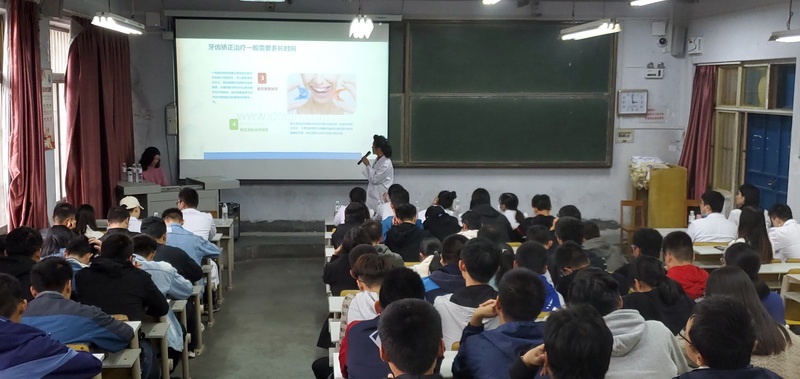 完莉首先向同学们介绍了口腔保健标准:牙齿整齐洁白、没有牙齿疾病、无龋洞、无疼痛感、无出血现象才是健康的口腔。随后她讲解了牙科疾病的病因机制,诊断分析及其预防和治疗方法。疾病的产生既有先天的遗传因素又存在后天的环境因素,如口腔不良习惯、替牙障碍等。其中咬唇、吮指等不良习惯均有可能引起错牙畸形。她结合真实案例向学生们展示了不健康用牙习惯所可能造成的严重后果,使同学们更直观的感受到保护牙齿的重要性。完莉着重指出:为避免龋齿,应尽量减少甜食的摄入,少喝碳酸饮料。每餐饭后均应使用正确的刷牙方法彻底清洁口腔,辅以牙线及间隙刷等口腔清洁用品,以避免牙齿釉质脱矿、龋齿、牙龈炎或其他并发症的发生。向同学们介绍了4种自我保健牙齿的方法:叩齿方法、鼓漱方法、运舌方法、牙龈按摩法。最后,同学们积极提问有关自身牙齿存在的问题,完莉给与耐心的解答。