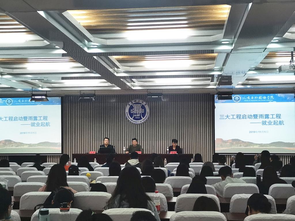 11月1日下午,人文与外国语学院在陵江路校区主教学楼一楼东报告厅召开“三大工程启动暨雨露工程之就业起航”大会,学生工作处副处长、创新创业学院副院长、就业指导中心主任鞠志强,365完美体育就业指导中心杨波,学院党总支副书记王振,学院校企合作辅导员王小燕参加大会,会议由就业辅导员王才升主持。