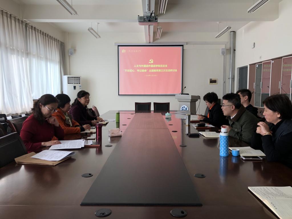 11月18日上午,根据学校“不忘初心、牢记使命”主题教育学习计划安排,人文与外国语学院党总支理论中心组在嘉陵江路校区主教学楼A410会议室召开主题教育第三次专题交流研讨会。交流研讨围绕“政治纪律和政治规矩、党性修养、廉洁自律”三个专题展开。会议由党总支书记王新主持会议,学校主题教育巡回指导组指导员林桂梅到场指导,学院理论中心组全体成员参加会议。