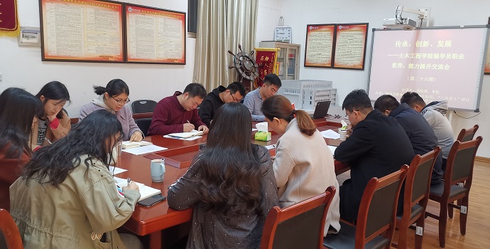 11月20日上午,土木工程学院于一教409会议室举办第二十六期“传承、创新、发展”辅导员职业素养、能力提升交流会,本次交流会围绕辅导员职业能力大赛、“三全育人”工作体系建设等内容进行了研讨,学生处处长焦红良到会指导,学院全体辅导员参加交流会,交流会由党总支副书记邵先锋主持。