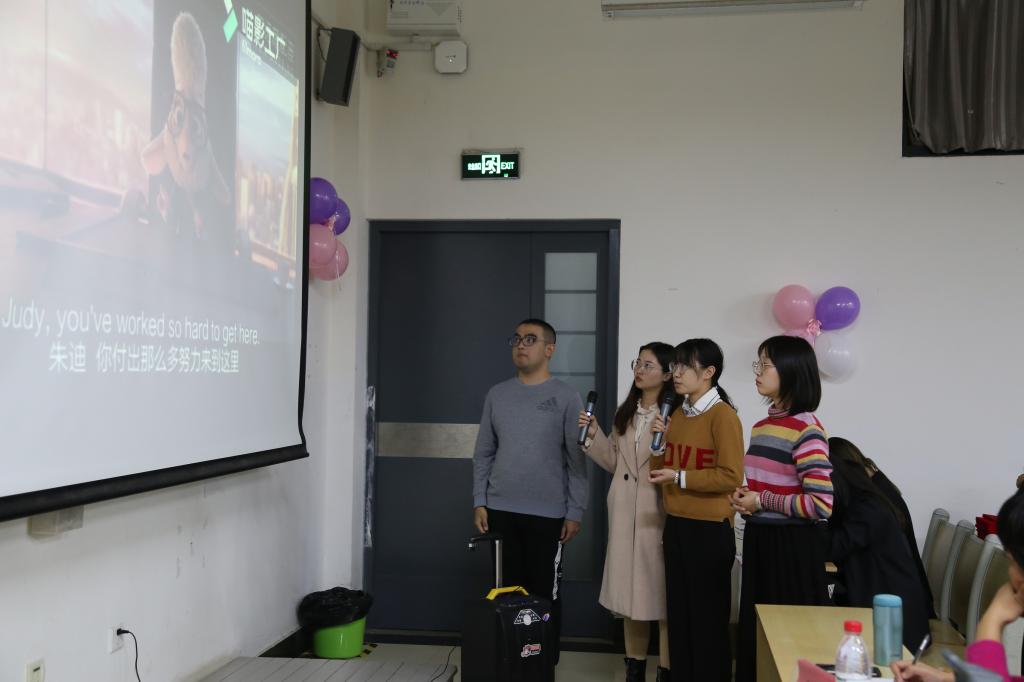 各兄弟学院的选手自信满怀,选材精准,精神面貌饱满,呈现一场视觉与听觉的盛宴。各评委根据选手的语言表达能力,配音节奏,影片难度,影片时长等标准进行打分。在专业组中,英语192班陈仕坤选手的冰雪奇缘作品以唱歌开头,说、唱结合,语调轻松活跃,一人饰演多个角色,让人耳目一新;英语182班陆再雪、舒逸晴组成的“杀鸡一百八”组合以危险毒苹果为题,两人声音惟妙惟肖,对白雪公主和老巫婆进行了完美的阐释。非专业组中,市北校区智建192班宋树波同学以粗犷、活龙活现的声音,对经典电影加入自己的理解,命名为《No Man Can Deliver》,征服了现场观众;造价183班的coincidence组合,在视频中插入文字,富有创意,英语与泰语结合,展现了不一样的风采。赛后,陈燕对本次大赛进行了点评,她以admiration敬佩、courage勇气和passion热情三个词为总结,表扬了同学们精彩的表现,并祝愿同学们始终怀以热爱,在英语的学习道路上越走越远。
