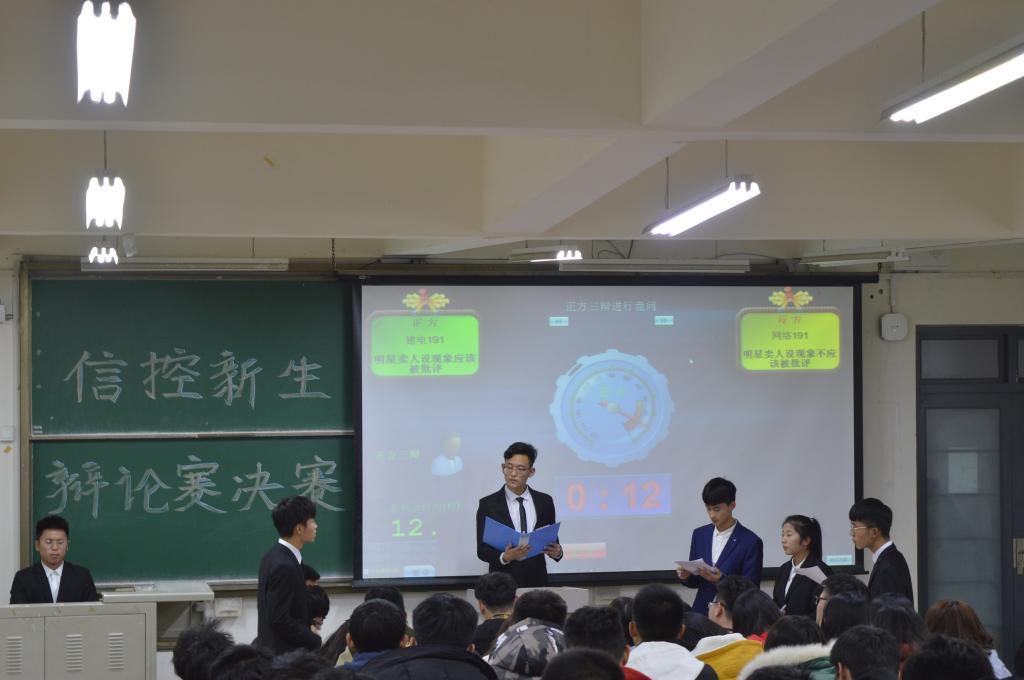 本次辩论赛成功闯入决赛的两只队伍分别是:正方建电191代表队、反方网络191代表队。比赛中,正反双方围绕“明星卖人设现象该不该被批评”这个热点话题展开辩论。比赛开始,双方辩手旁征博引,唇枪舌剑,围绕着论题,充分结合了理论与现实,论辩有力,旗鼓相当。两队经过了立论陈词、攻辩阶段、攻辩小结、自由辩论和总结陈词五个环节的激烈的角逐,反方获得本次比赛的冠军。