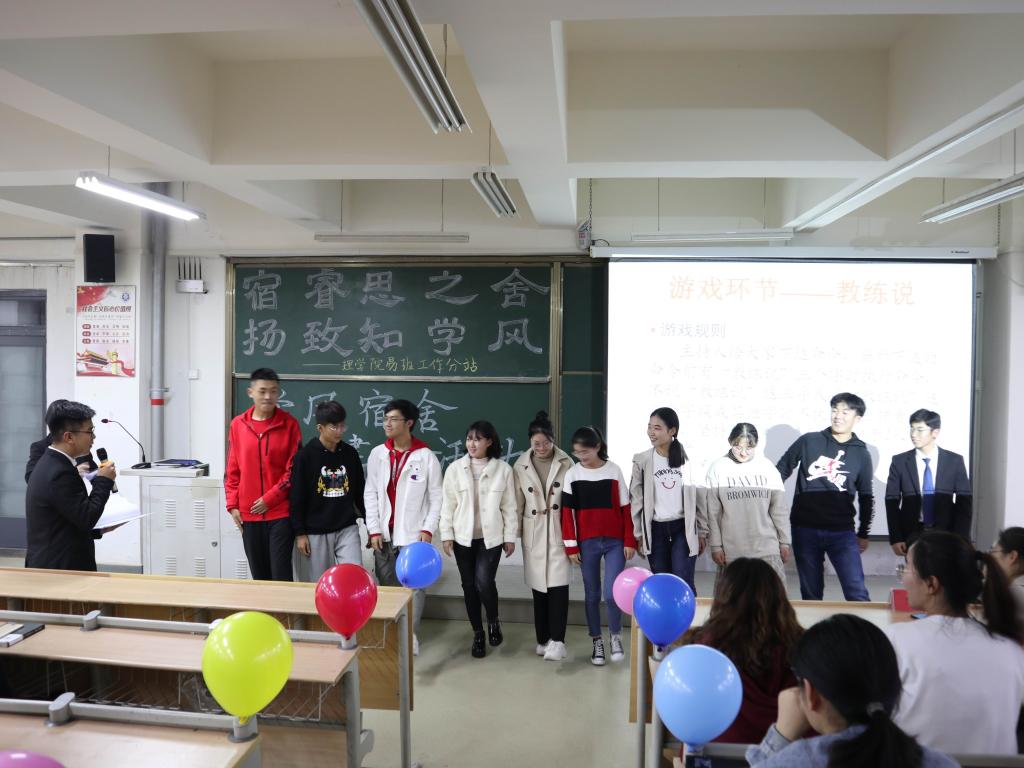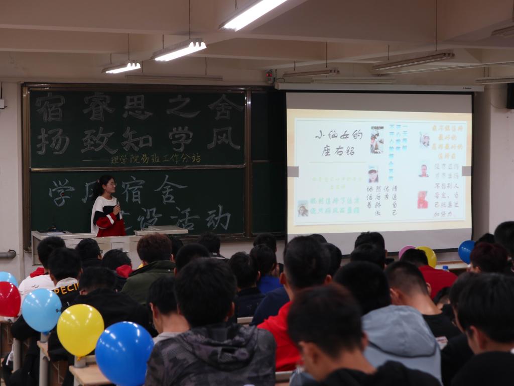 为促进学院学生学习的积极性,督促学生养成良好的学习习惯,充分发挥宿舍的育人功能,营造积极上进的学习氛围,11月22日下午,理学院在嘉陵江路校区主教学楼B235教室举办了“宿睿思之舍,扬致知学风”学风建设活动。学院党总支副书记刘聘、分团委书记李晓辉、辅导员公圆圆参加此次活动。