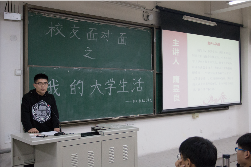 为更好的推进“精英培育计划”,促进学生学业、职业发展,助力学生实现梦想,11月24日下午,机械与汽车工程学院在B135教室举办了以“我的大学生活“为主题的”卓越校友面对面“分享会。此次分享会由2014级校友隋昱良和孙伟主讲,2018级辅导员徐卫晓及200多名机械专业的学生参加此次分享会。