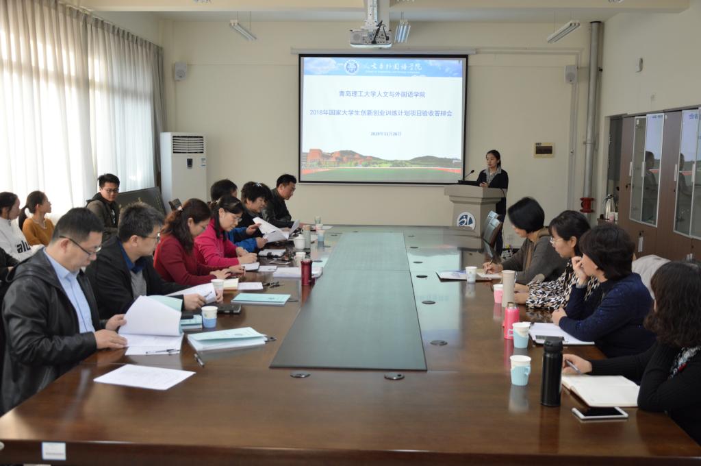 11月26日下午,人文与外国语学院2018年国家级大学生创新创业训练项目验收答辩会在A410会议室举行。党总支书记王新、院长巩湘红、教务处实践科科长刘林波和学院创新创业导师代表等9名老师组成评审小组,2018年国创项目5个团队代表和指导教师共同参与加了此次验收答辩会。答辩由副院长王晓东主持。