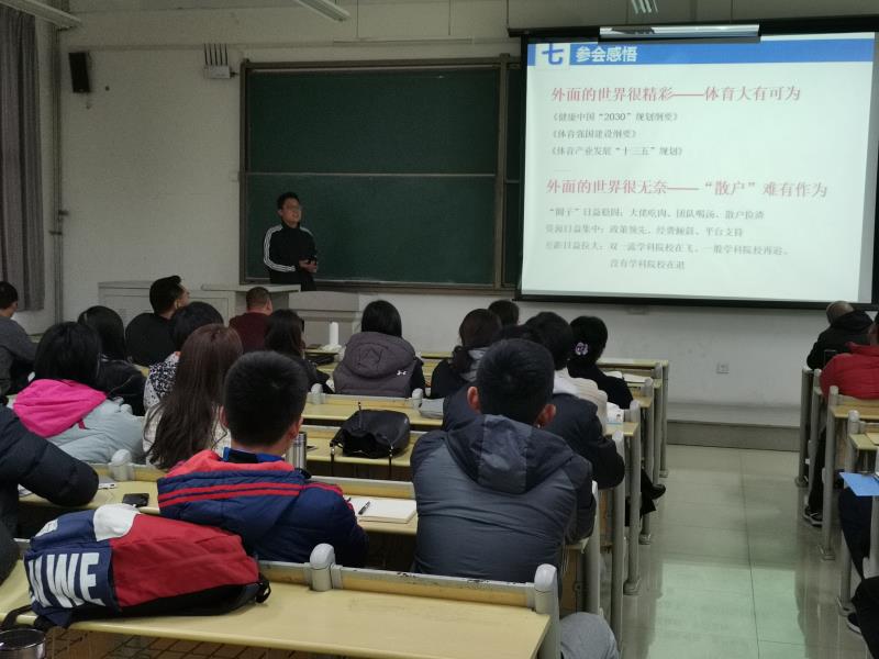 11月27日下午,体育教学部在嘉陵江路校区主教学楼A129教室召开全体职工大会,李旭龙博士向全体教师传达第十一届全国体育科学大会的精神和个人参会的体会,会议由体育教学部主任王龙主持。