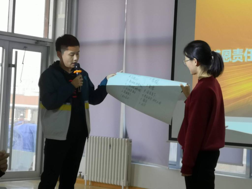 本次培训中,讲师以互动式、体验式、启发式的高效教学模式引导同学们在人生的路上常怀感恩之心,对待生命中无论是美好事物亦或是困苦磨难,都要懂得感恩回馈,要以生活“投我以桃”,我要“报之以李”的生活态度去面对一切。在此基础上,讲师从让同学们自己在不同环境下“所扮演的角色”、“所担负的责任”、“所受到的感悟”这三个方面引导同学们去体验与感受。参与的同学们深刻的领悟到:无论是顺境还是逆境,凡是生活给予的,他人给予的,就值得我们去细细品味,更值得我们一生感恩,并在之后的日子里知“恩”而后勇,励志远行。