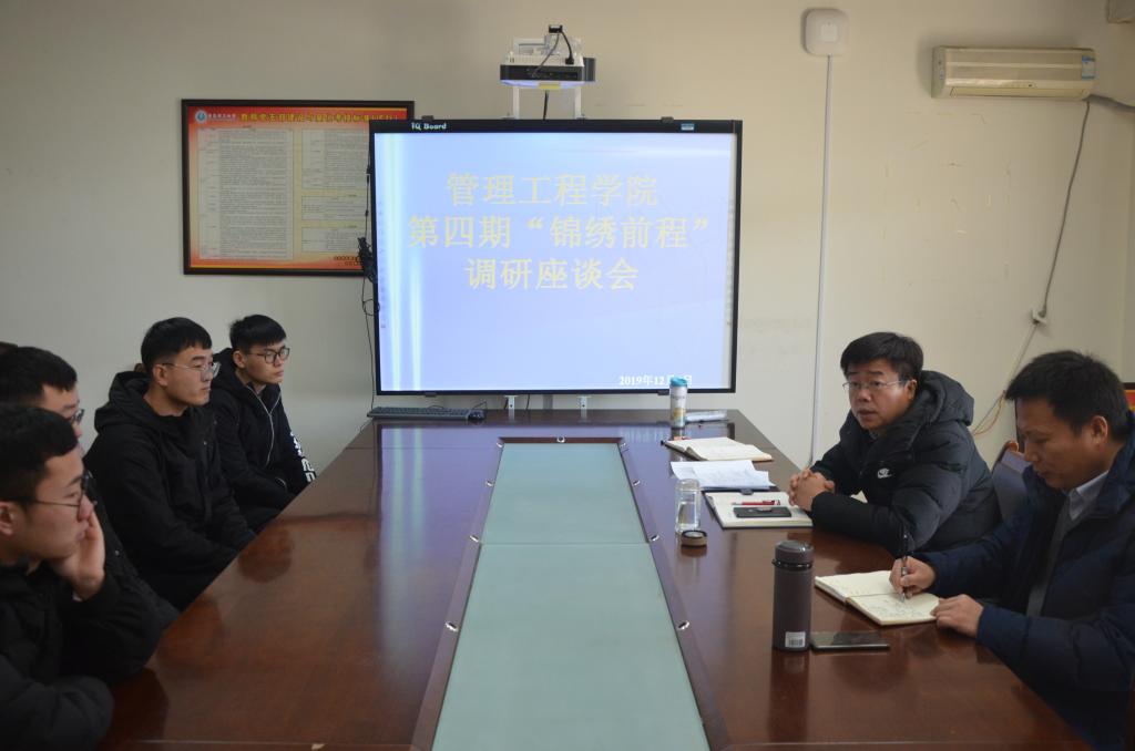 为进一步落实学院2020届本科毕业生就业工作,动态掌握学生的求职就业情况,提高大学生就业的主动性、积极性,12月4日上午,管理工程学院在A212会议室举办了第四期“锦绣前程”就业工作促进会议,特别邀请工程管理教研室王志强老师参加本次活动。学院党总支副书记于利俊、学院就业工作辅导员张翔,工管185、186班部分学生参加本次座谈会。