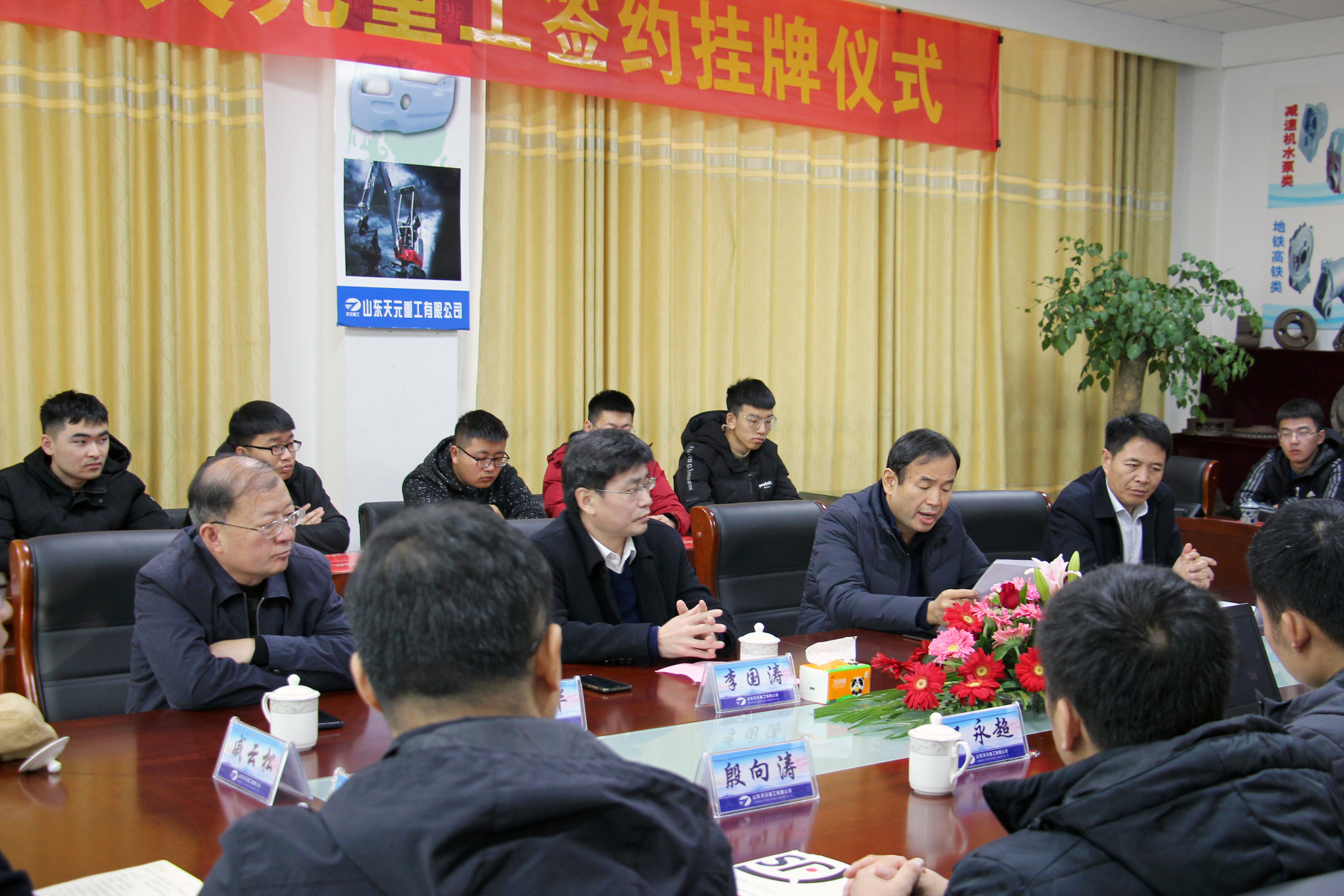 为深入贯彻学校党委“对接临沂、融入临沂、服务临沂”决策部署,进一步深化产教融合,12月4日上午,临沂校区党委常务副书记李国涛、合作发展办公室主任王跃华及相关系部师生代表一行19人赴山东天元重工有限公司开展校企合作签约挂牌仪式,山东天元重工董事长张金山、东蒙镇党委书记郭永军、总经理刘宗山、县派“红领书记”黄金生等出席活动。