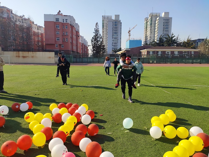 “彩虹跑”健心活动是绿丝带健心协会“暖冬系列活动”之一,共吸引了五十余支队伍参加比赛。活动为闯关游戏,两人自由组队。第一关为结队而行,两人绑腿,五十米折返跑计时,主要是测试两人的配合默契程度。第二关为“瞎子背瘸子”,先用气球提前布置好场地,A蒙眼背着B,B指导A踩碎指定气球,踩爆两个即可过关,踩爆其它气球者需从第一关重新开始。各队选手配合默契,精确地踩爆指定的气球,顺利进去下一关卡。第三关为心有灵犀,一人描述词语,不能说出与给定词语相同或同音的字,另一人猜词,同学们发挥自己的想象力,尽可能给队友最准确的提示。本次比赛共设有七关,通过各关卡的时间累积最少来进行排名,最终,中美182杨传东与中美182曲金龙获得“彩虹跑”健心活动的冠军。