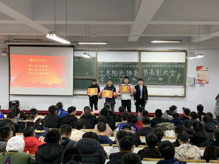 12月11日,土木工程学院于一教200阶举办2019年阳光体育节总结表彰大会,学院学生工作办公室主任、分团委书记王中帅老师,辅导员徐杨杨及各班代表同学参加本次活动。