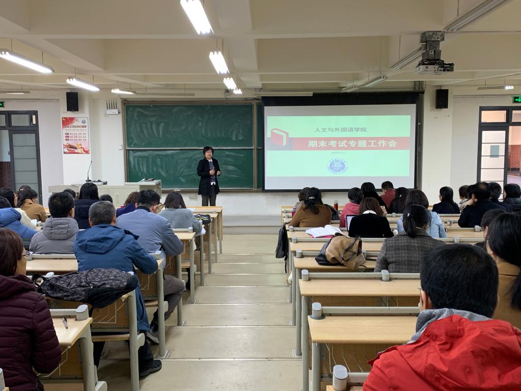 12月11日下午,人文与外国语学院在嘉陵江路校区主教学楼B201召开期末教学工作专题大会,会议由院长巩湘红主持,学院全体教职工参加会议。