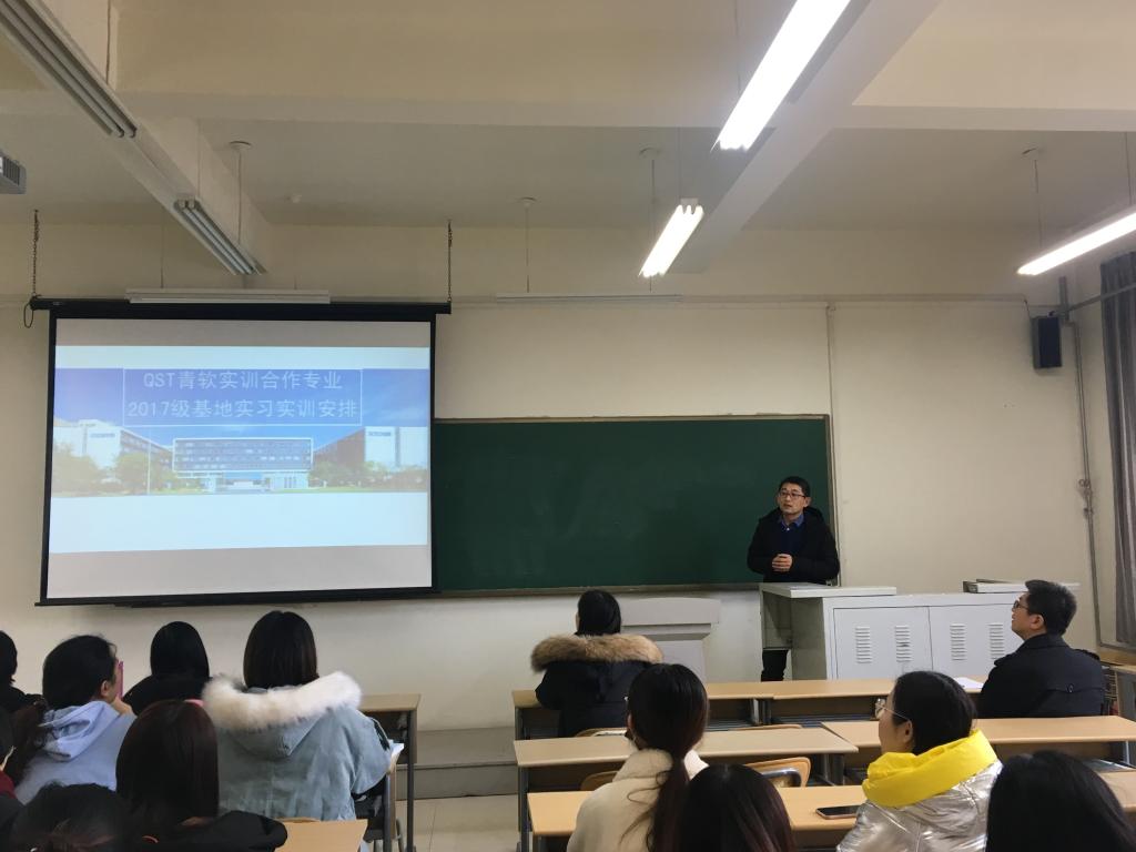 按照校企合作方向的培养计划,日语专业2017级2班的同学将于下学期起前往青软实训基地进行实训学习,主要包括软件开发基础、软件初级和高级开发、企业框架实训等内容。为了让学生更好地了解课程内容和基地的相关情况,日语专业教研室主任王星、青软基地教学部副总监赵锦明详细介绍了课程与学分、内容、上课方式等问题,企业辅导员介绍了基地的基础设施和相关规定。王晓东、王振分别就学生们关心的专业学习、职业发展规划等进行了讲解,17级辅导员辛雪梅和班主任也对同学们提出了具体要求和希望。