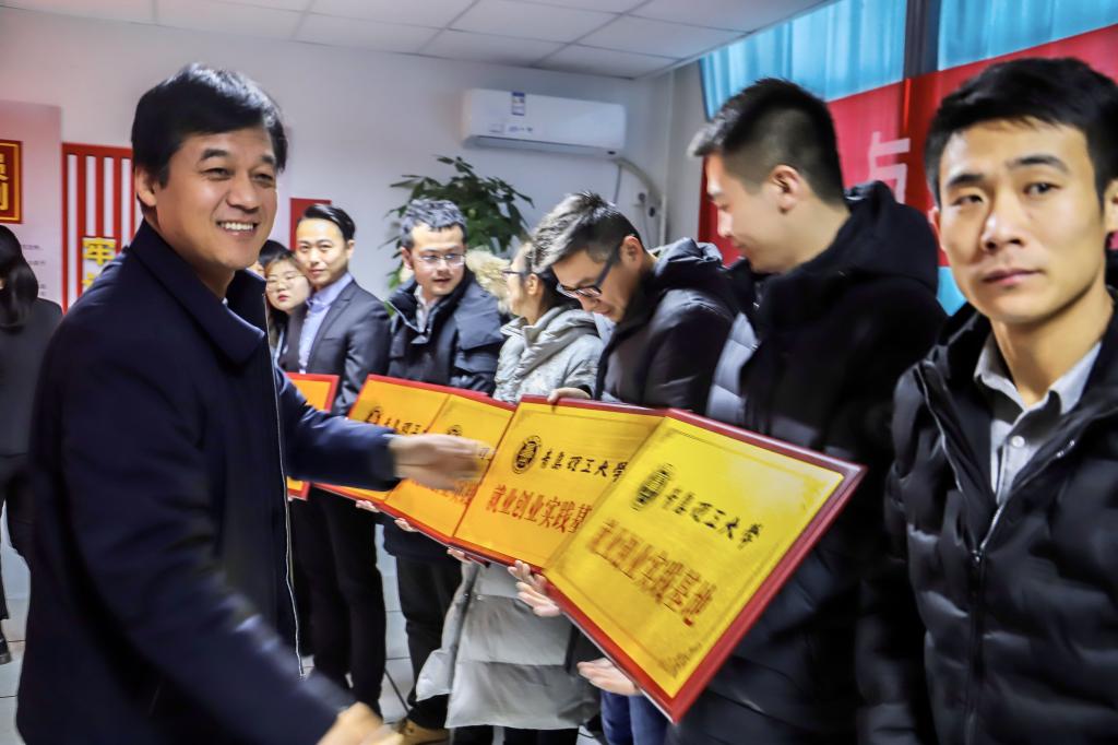 周玉国代表学院与相关企业负责人签订了产学研合作与学生实习就业基地共建协议,并与董典同一起为签约企业颁授了365完美体育就业创业基地铜牌。