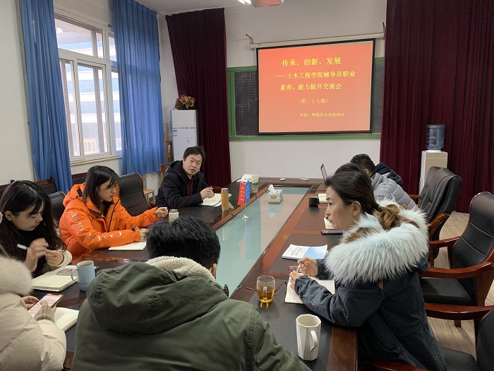 1月7日,土木工程学院在市北校区一教306会议室举办第二十七期“传承、创新、发展”辅导员职业素养、能力提升交流会,本次交流围绕大学生寒假社会实践主题展开,学院党总支副书记邵先锋,学生工作办公室主任、分团委书记王中帅及全体辅导员参加交流会。