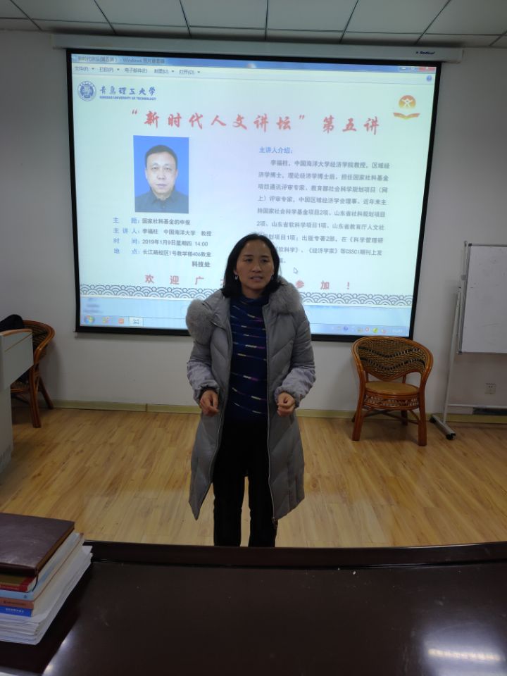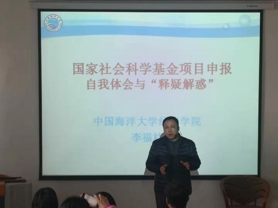 1月9日下午,由科技处主办的新时代人文讲坛第五讲-国家社科基金项目的申报在长江路校区一号教学楼406教室举行。本次讲座由中国海洋大学经济学院李福柱教授担任主讲,科技处副处长周红燕主持会议,各文科学院教师参加会议。