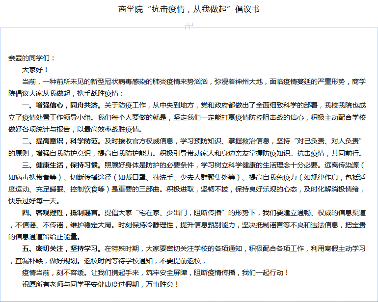 为进一步贯彻落实学校关于新型肺炎疫情防控工作的要求,引导广大商院学子科学防疫,商学院在易班发起“抗击疫情,从我做起”倡议书。