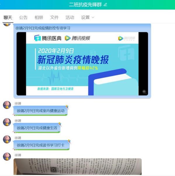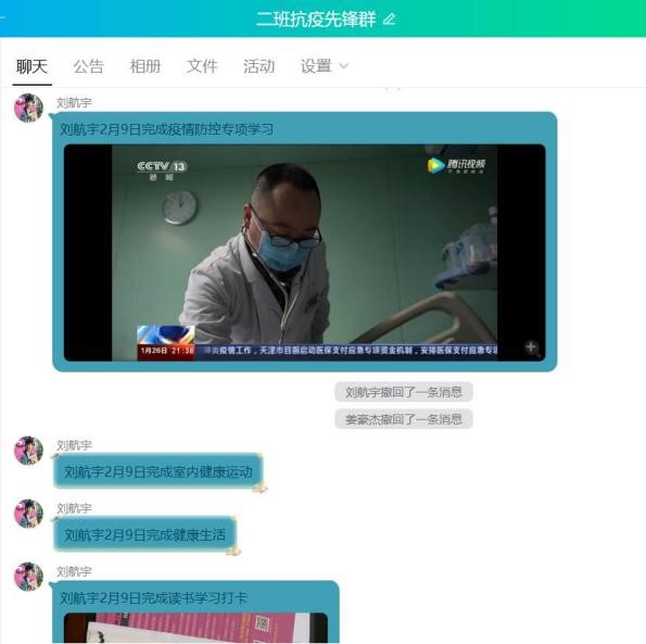 活动伊始,班级全体同学一起观看了火神山、雷神山医院的建设相关直播视频,同学们纷纷为“中国速度”点赞,作为土木学子,专业认同度也得到了提高,大家表示以后一定要在土建行业为祖国建设贡献出力量。疫情当前,足不出户,假期变长,同学们都自主合理地安排好了假期生活,用计划约束自己,用行动完善自己,配合学院打卡计划让假期变得更有律、有序。在线分享阶段, 8位同学向大家分享了自己的假期生活和学习安排。大家一致认为,打卡活动可以提高假期在家的积极性,起到了有效地督促作用。活动期间,同学们表达了对班内倡议书的认可、肯定了班级网络防疫专栏的建设,一致同意为每日打卡增设几个新目标,并决定积极参加学院的拓展活动。不负韶华,只争朝夕,充实地、有意义地度过这个寒假。
