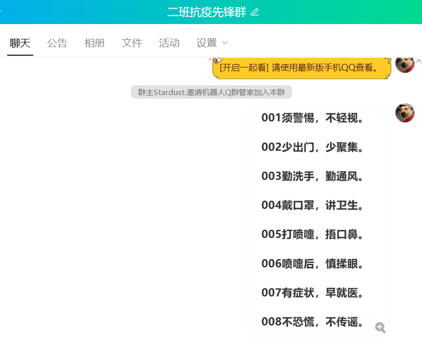 最后,同学们重温了48字防控疫情守则,确定了假期三条准则,切实担起与祖国同命运,与人民共患难的责任。本次团日活动在激昂的《光荣啊!中国共青团》歌声中落下了帷幕。