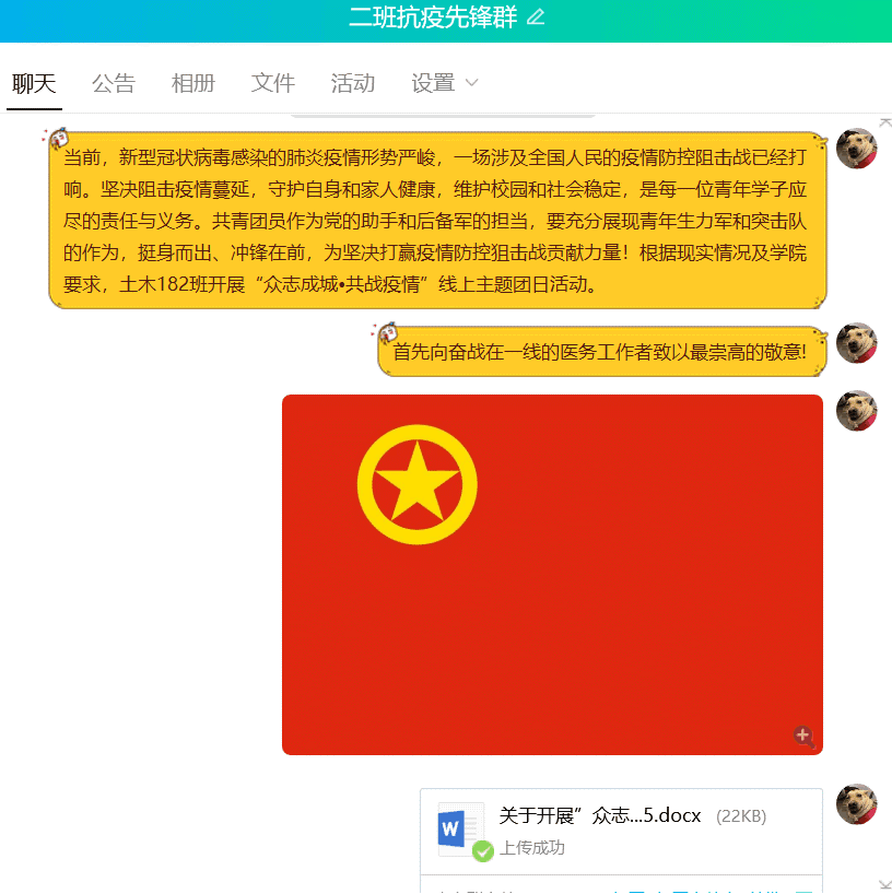 活动按照校团委下发的《关于开展“众志成城·共战疫情”线上主题团日活动的通知》及学院分团委的相关工作要求进行,同学们线上一起看火神山、雷神山医院建设直播并分享感受,进行假期生活分享,集体讨论线上特别团日活动“5+1”计划,发布倡议书云签名以及班内防疫专栏建设情况等方面展开。通过主题团日活动、朋辈教育的方式,号召更多的团员青年积极行动起来,在党的领导下凝心聚力共同打赢抗击疫情阻击战。