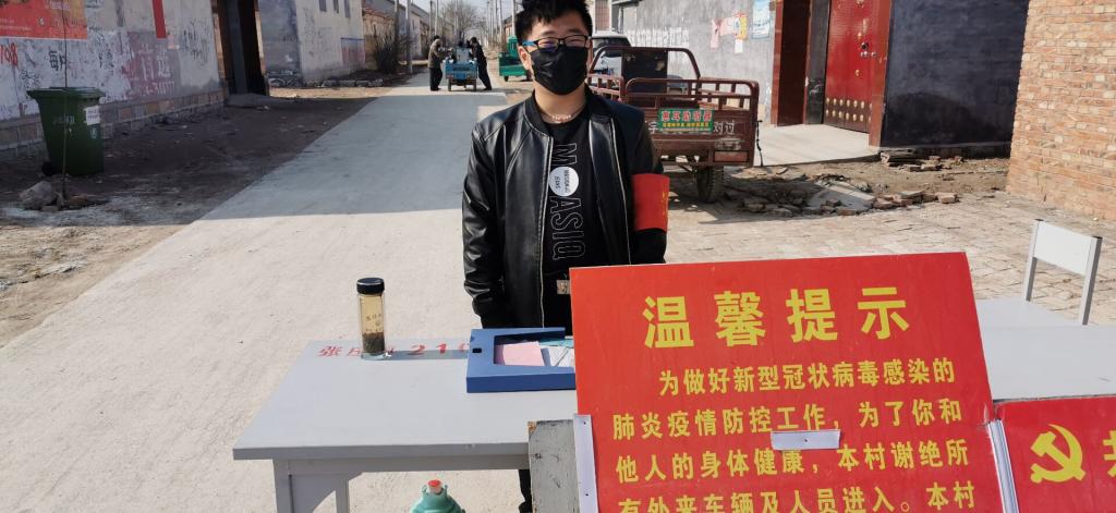 物理171班学生熊新宇,山东省德州市禹城市人。疫情发生后,他时刻关注疫情发展,当他看到村里发布招募志愿者消息后,第一时间报名,从2月3日开始,与村里的志愿者轮流值班,每天8:00-22:00在村口负责登记出入人员信息,劝阻外来人员,劝戒村内人员少出门。他说:“身为一名大学生,本身应该为国家和社会做贡献,在这关键时期,做好村口的疫情防控,站好这一班岗,也是为国家和社会贡献自己微不足道的力量。”