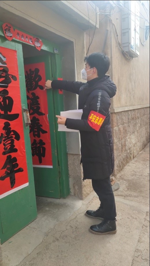 家住青岛市城阳区的纪成宽同学,在疫情肆虐前,毅然决然冲到了防疫前线。当村委会招募入户调查员时,他第一时间主动请缨,成为一名光荣的平安志愿者,冲到了社区疫情防控第一线。他坚持每天入户调查,登记村民健康情况,为村民普及防疫知识,维护居民身体安全,将疫情传播扼杀在摇篮里。作为最基层的防疫人员,他尽心竭力,为抗击疫情贡献一份青春力量。