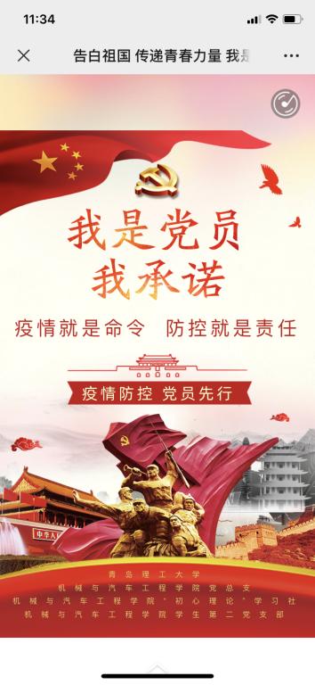 此次活动的举办,充分发挥了机械与汽车工程学院党总支基层战斗堡垒作用和全体党员师生的党员先锋模范作用。众志成城战疫情,切实做好自身及家人的防护工作是每个党员的义务与责任。以承诺促行动,传递青春力量,不让祖国担心、让祖国放心,我们就一定能打赢这场疫情防控阻击战!(撰稿:解新美、王悦佳、王成;审核:林海涛)