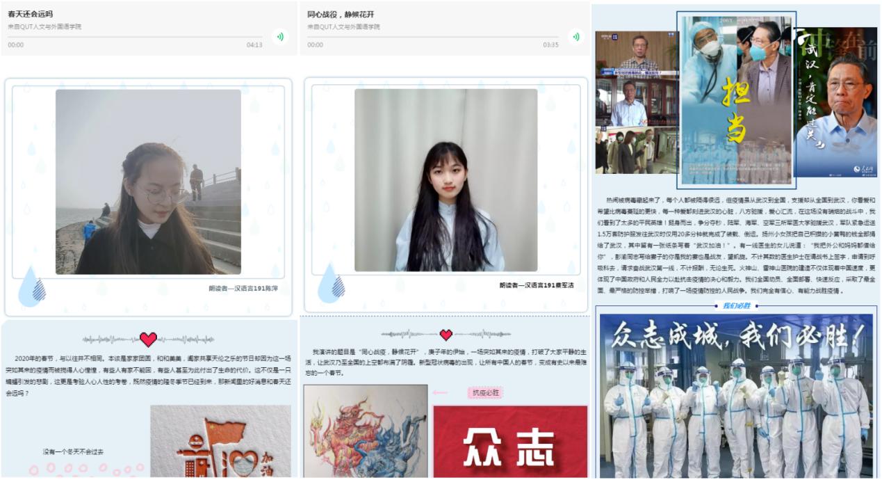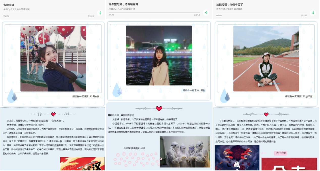 活动一经发布,便受到了学生的积极响应,第一期征稿结束,共收集到来自各团支部原创的稿件、音频共30余份,同学们用自己的真情实感写下了对“逆行者”英雄们的致敬、对疫情结束后的期许和对打赢全民阻击战和总体战的坚定信心,并以音频的形式讲出了青年学生心中的关切,喊出了对武汉的加油和伟大祖国的美好祝愿。学院特此选取12件优秀作品推送至学院微信公众号“‘疫’起发声,携手同行,待春暖花开——朗诵篇特辑”专栏进行展示。其中我院学生代表汉语言171班刘洋侨在《抗战疫情,你们辛苦了》中写到:“哪有什么岁月静好,只是有人在替我们负重前行”,向奋战在一线的战士们表达了深深的敬意,并为他们祈福助威;社工181班易彤在作品《怀希望与爱,待春暖花开》中表示:“一个经历过五千年风霜的国家,不曾也不将被任何困难打倒”,对疫情的发展进行了积极的展望,呼吁大家保持信心,定会打赢这场战“疫”;汉语言191班陈萍在《春天还会远吗》中说:“武汉只是生病了,围绕在他身边的乌云终有一天会消失殆尽”,表达了对武汉早日康复的迫切心情。我院学子用慷慨激昂、精神饱满的朗诵倾诉着对一线医护战士们的关怀,坚定我国必将战胜此次疫情的信念。