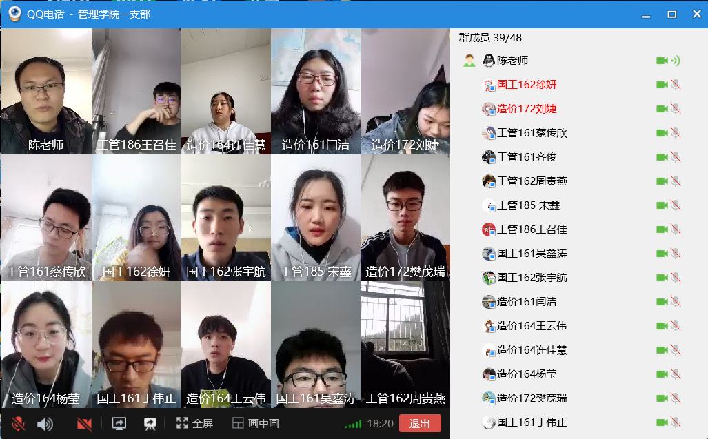 自疫情爆发以来,大学生群体受到各级组织的关心爱护,收到数封充满关爱的信件,为进一步促进支部党员学习领会党中央及各级党组织关于疫情防控的指示精神,贯彻落实防疫期间对大学生的部署要求,充分发挥学生党员的先锋模范作用,2月15日,管理工程学院本科生一支部组织开展“我承诺、我践行——致各级党组织的一封回信”线上活动,支部委员张冯冯老师和37名学生党员全部参加,会议由支部书记陈永亮老师主持。