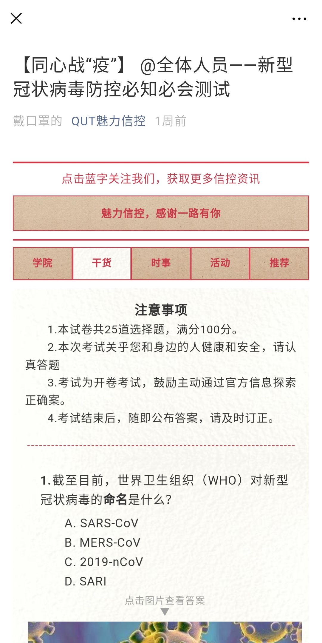 为让学院师生进一步了解科学的疫情防控知识,学院组织了“@全体人员——新型冠状病毒防控必知必会测试”,要求学院师生线上作答,即知即改,达到了良好的宣传普及效果。
