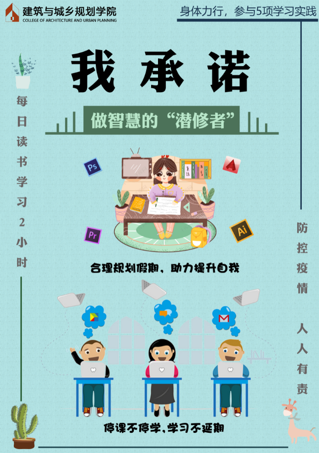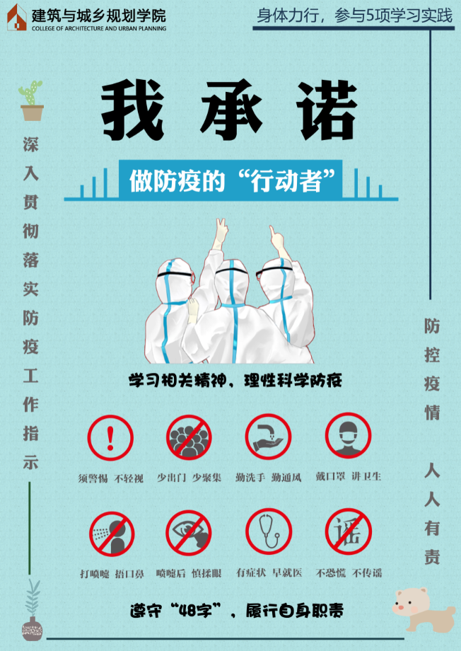 一幅幅充满创意的海报设计展现了疫情面前建筑与城乡规划学院同学们积极向上的精神风貌,提升了同学们的动手设计能力和专业知识技能,提高了同学们对疫情的防范意识,呼吁大家为夺取抗击新型冠状病毒感染肺炎疫情斗争的胜利贡献自身青春力量。(撰稿:董昕、王鹏飞;审核:高江)