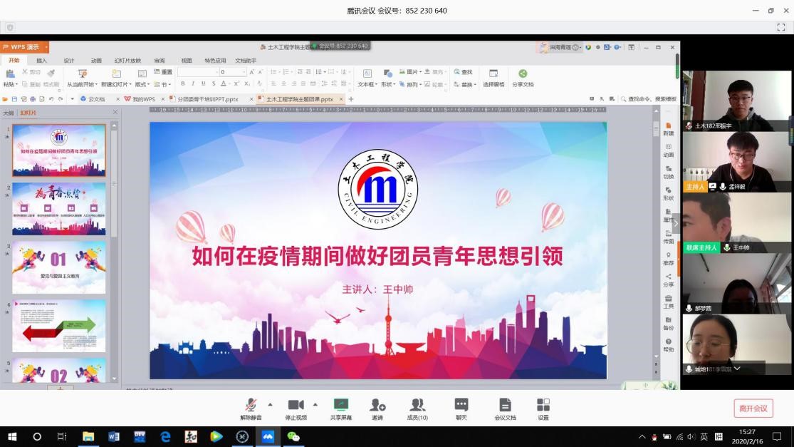 2月16日,土木工程学院分团委召开线上学团骨干主题团课。本次团课由学院学生工作办公室主任、分团委书记王中帅主讲,学院分团委委员、学生会骨干及各支部团支书代表参加团课学习。