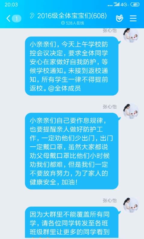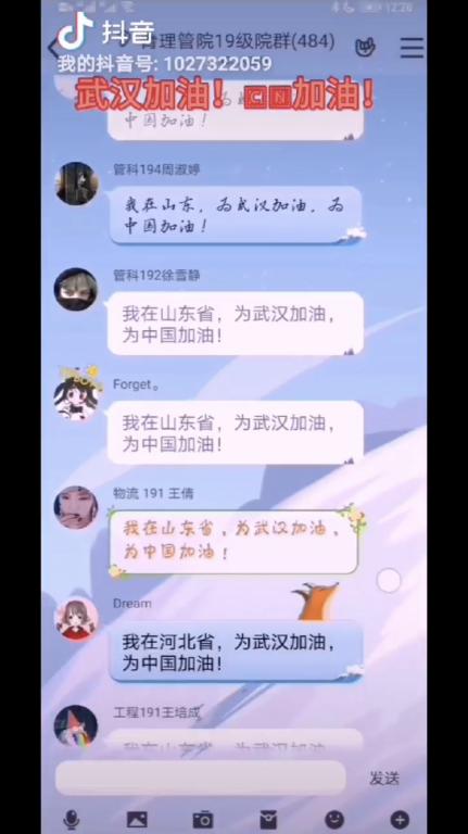学院和老师们的努力没有白费,在这场疫情中,学院的学生呈现出高度的责任感和使命感,因为疫情控制需要,大量的数据和表格需要班委完成,没有抱怨和懈怠,所有的班委都在努力配合。更有同学站到了抗“疫”一线,孙瑜昕、王吉喆等同学成为村子或者小区的“护卫者”,张幸同学成为青年志愿者服务队的一员,近距离接触着被隔离人员,戴纤同学主动承担起为一线防疫工作者送饭的职责。同学们纷纷响应学院的号召,展开一系列的防疫活动,为武汉录制加油视频,进行线上承诺接龙活动。老师和同学们之间有了前所未有的理解和支持,在一次工作任务布置当中,辅导员王老师因重感冒一直在咳嗽,结束后马上就有同学询问情况,让王老师注意休息,表示有事情他们可以随时帮忙。