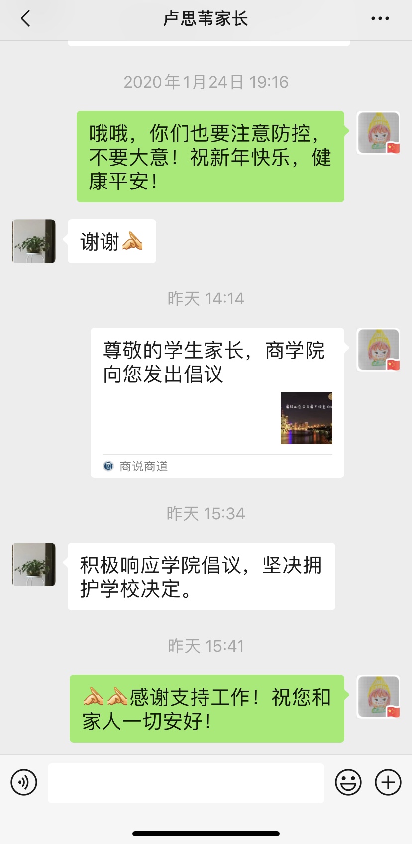 “积极响应学院倡议,坚决拥护学校决定!”这是商学院统计182班卢思苇家长在收到倡议书后给予的回复。