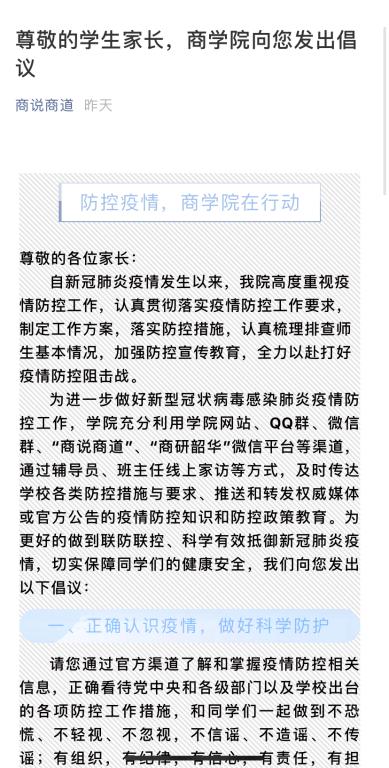 为全面做好疫情防控工作,促进家校联动,科学有效抵御新冠肺炎疫情,切实保障全体学生及家人的健康安全,商学院向学生家长发出了线上倡议书。倡议学生家长正确认识疫情,科学做好学生健康防护,并积极配合学校做好信息摸排工作,倡议家长密切关注学院学习安排及活动,教育引导学生积极参加学院组织的网络直播补习班等学风建设活动,充分利用假期时间合理安排学习生活,做到“抗‘疫’学习两不误”,最大限度保证学习质量,倡议家长积极配合学院“悦跃行动”等身心健康教育工作,引导学生理智地对待疫情,耐心等待开学。