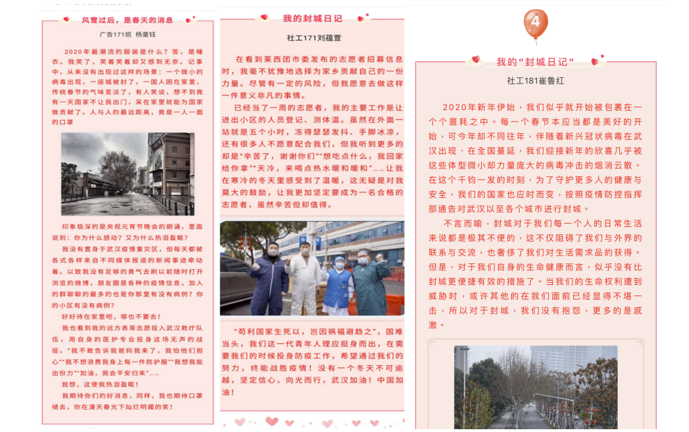 本次活动在各团支部积极响应和同学们主动参与下。现共收集作品179份,涌现出大批选手的优秀作品。其中,日语172任凯惠在日记中表示:“这次新冠状病毒事件更坚定了我要做社会有用之人和为人民做奉献的心”;英语173苏奕丹更是在日记中记录了这样一句话:“哪怕是世界上的微尘,太阳一出来,也是有歌有舞”;社工181崔鲁红在日记中写到“对于封城,我们没有抱怨,更多的是感激”,都阐述了封城对自己的生活、假期的影响和疫情之下自己的内心变化。社工171刘蕴萱在日记中表示:“国难当头,我们这一代青年人理应挺身而出”,记录了自己成为志愿者的心理感受,展现了新一代青年积极向上、崇德向善的精神风貌,以及对国家大事的关心和对战胜疫情的信心。优秀作品将陆续推送至学院微信公众号进行展示。
