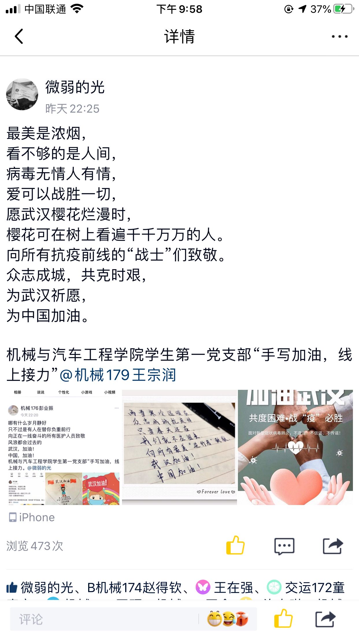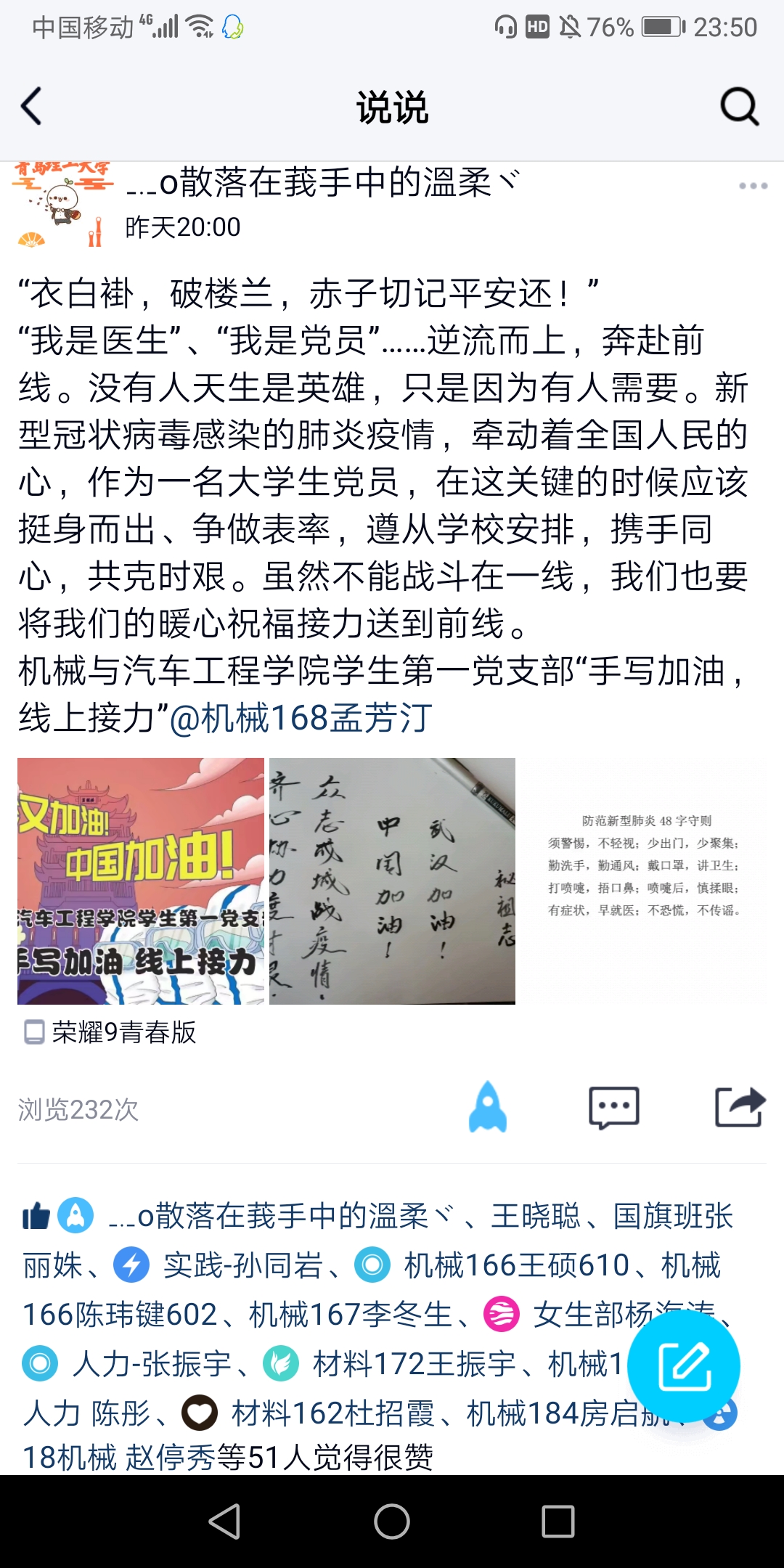 一名党员就是一面旗帜,一个岗位就是一份责任。在疫情防控工作的关键时期,机械与汽车工程学院学生第一党支部举办“手写加油,线上暖心接力”党日活动。考虑到理工学子应用最多的社交软件为腾讯QQ,关注比较多的是QQ空间动态消息,活动采取在QQ空间发表暖心祝福@接力说说的形式,营造人人可参与防控疫情的氛围,吸引更多同学加入,为抗击疫情贡献一份自己的力量。