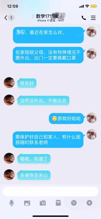 结合“心开始”网上谈心工作,全体辅导员还通过微信朋友圈、QQ等方式,积极将学校关于疫情防控的最新要求、学校的关心关爱传递给每一名学生。在这场防疫攻坚战中,理学院辅导员始终用心教导学生,用爱陪伴成长,与学生一同为迎接春暖花开的新学期做好准备。(撰稿:张晓双;审核:刘聘)